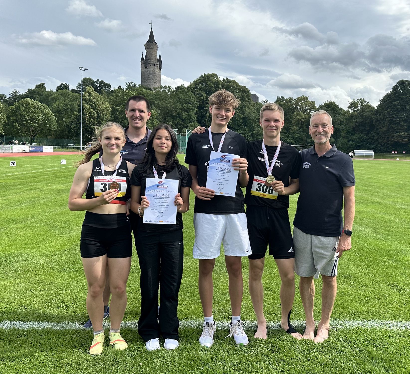 In einem großen Starterfeld von 16 Mädchen in ihrer Altersklasse übersprang Leni Gehrt alle Höhen bis einschließlich 1,48m im ersten Versuch und scheiterte nur knapp an der Höhe von 1,51m. Mit ihrem Trainer Klaus Volkmar konnte sich die Eschwegerin über die Bronzemedaille freuen.